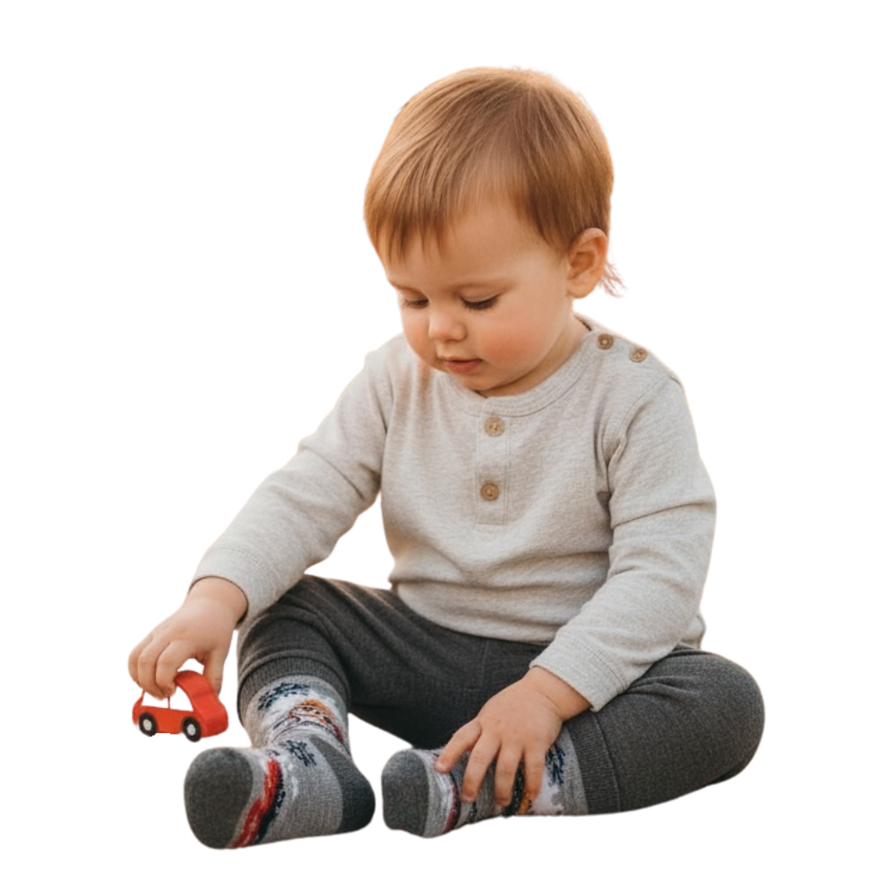 Finally, wool toddler socks that actually fit and stay put through every adventure. Born from our frustration about other socks not fitting right or being warm enough. These socks keep little feet warm, dry, and happy so you can explore longer and worry less. Made from soft, sustainable merino wool and recycled materials designed for comfort, durability, and connection — because every step outside is a step closer together.